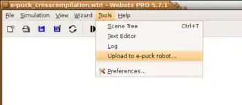 - The cross-compilation: You can write the same program, cross-compile it for the e-puck processor and upload it on the real robot. In this case, the previous firmware is substituted by your program. In this case, your program is not dependent on Webots and can survive after the rebooting of the e-puck.