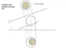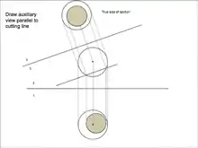 This will give us the true size of the section of the sphere. The auxiliary view is constructed by simply transferring distances. (Fig1.3)