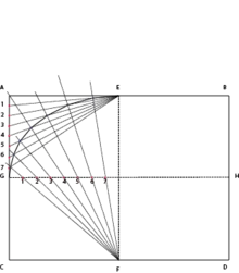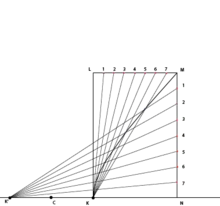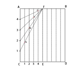 1. Start with rectangle ABCD. Find midpoints of AB and CD and connect. Divide CE and AC into equal parts. Draw a perpendicular line to CE on each of the points on CE.