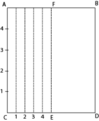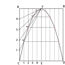 1. Create a rectangle ABCD. Find the midpoints of each line and connect the points to divide the rectangle into quadrants. Divide AG and GO into equal number of parts using the division method.