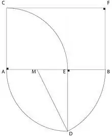 3. Label the midpoint of AE with point M and draw a construction line between points M and D. Draw an arc from point M to connect the line perpendicular to AC. Label that point with B