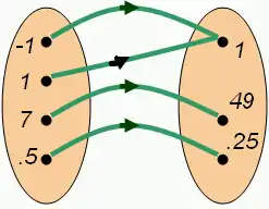 A function is a relationship between two sets of numbers. We may think of this as a mapping; a function maps a number in one set to a number in another set. Notice that a function maps values to one and only one value. Two values in one set could map to one value, but one value must never map to two values: that would be a relation, not a function.