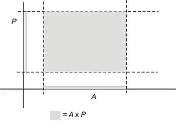 The region representing the Cartesian product A × P is then represented by the points whose x- and y-coordinates lie within these sets A and P. Like this: