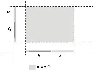 Finally, when we represent the set B × Q as a rectangle whose limits are determined by the limits of B and Q, it is clear that this rectangle will lie within the rectangle representing A × P: