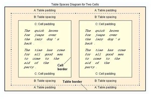 - The example below has various borders. Initially, there are no all-round borders on this basic table. An outer border is set for the table perimeter, and various borders are set for the bottom of the individual cells. In addition, the background color of the whole table has been changed to lightyellow, then the heading color changed after that to brown. The text color of the headings has been set to white to give better contrast against the new background. Follow the details in the example below: