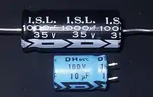 Axial electrolytic capacitors are electrolytic capacitors that have connections on both ends. These are most frequently used in devices where there is no space for vertically mounted capacitors. See photograph above.