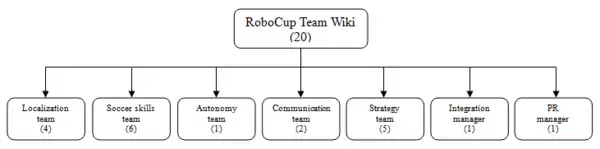 To garantuee the above mentioned cooperation between the different teams, an integration manager is appointed. The integration manager is a generalist with a broad technical knowledge, able to “see the total picture” and make one coherent system from different components. Every team also needs a public relations (PR) manager to promote the team and make the necesarry arrangements to compete in the different tournaments. An overview of the different teams of RoboCup Team Wiki with the corresponding number of members (#) is given in Figure 2.