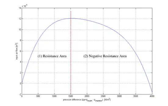 Figure 3 is roughly divided by two parts. The left part shows a resistance-like feature, i.e., the air flow increases with increasing difference between the mouth pressure and the mouthpiece pressure. The right part shows a negative resistance, i.e., the air flow decreases with increasing pressure difference. The AC oscillating only occurs within the right part, so the player must play with a mouth pressure that fall into a certain range. Specifically, the pressure difference must be larger than the minimum pressure corresponding to the beginning of the right part, while no more than the maximum pressure that will shut the reed off.