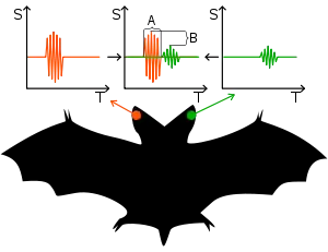 Echolocation is a form of acoustics that uses active sonar to locate objects. Many animals, such as bats and dolphins, use this method to hunt, to avoid predators, and to navigate by emitting sounds and then analyzing the reflected waves. Animals with the ability of echolocation rely on multiple receivers to allow a better perception of the objects’ distance and direction. By noting a difference in sound level and the delay in arrival time of the reflected sound, the animal determines the location of the object, as well as its size, its density, and other features. Humans with visual disabilities are also capable of applying biosonar to facilitate their navigation. This page will focus mainly on how echolocation works in bats and dolphins.