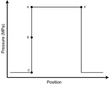 Examine point A': It is moving into un-shocked material with wave speed and associated particle speed . In contrast, point A is moving into already shocked material at significantly higher pressure and density and thus with higher particle velocity, and wave speeds . Consequently, point A will be moving significantly faster than point A' and will soon overtake the front. Now examine point C. It has been relieved down to ambient conditions and thus has a low associated wave speed. It will thus lag progressively further and further behind point A. As the shock-wave wave propagates, the line A-C will stretch out and thus angle down. This can be see as an averaging out of the shock pulse amplitude over a larger and large front thickness. This averaging serves to attenuate the pulse until the pressure decays below the elastic limit and the shock-wave devolves into an acoustic wave. The line A-C is in fact a wave process with a propagation velocity faster than that of the shock front. Such a wave is known as a rarefaction and it is a fundamental characteristic of shock-wave processes. The rarefaction attenuation process is depicted in the following figure:
