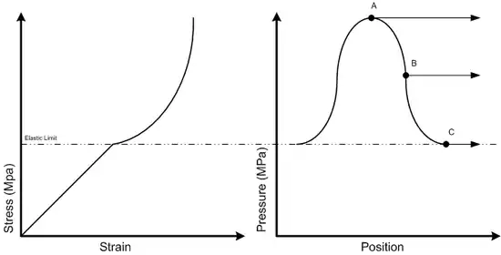 It is most intuitive to consider how a shock wave is formed by considering the process in an elastic solid as the behaviour can then be extended in principle to fluids. For a linear-elastic material, behaviour under compressive loading can be broadly described by two regimes. In the elastic regime the deformation (strain) is directly proportional to the stress applied to it. Above a certain critical stress level (termed the yield stress) the strain is no longer directly proportional to the stress and the material begins to behave nonlinearly - this is the plastic regime.