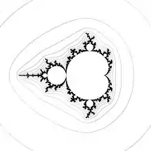 - c = -0.750087705298239 +0.014275963195317 *i, ( Mandel can not draw such equipotential line)
