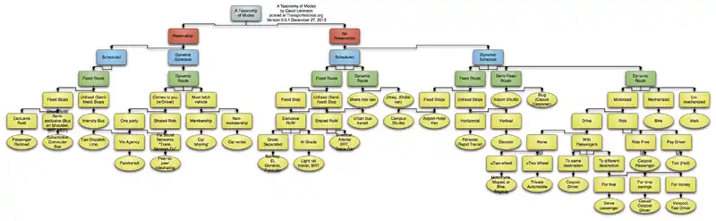 This distinguishes primarily on the non-mechanical (non-propulsion) characteristics of the service. Of course not every possible dimension is identified, and a few of the circles contain multiple modes which are otherwise obviously distinct (e.g. gondolas and subways are much the same from a transportation service perspective but for one is underground and uses a train and the other is suspended by a cable which moves it). This taxonomy differentiates things that were qualitatively different rather than quantitatively different.