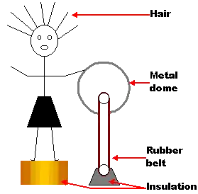In the diagram above a girl is standing on a washing up bowl and touching a Van de Graaf machine.