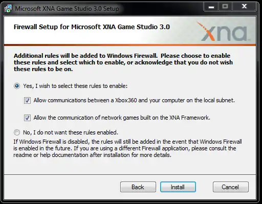 After having run Visual Studio at least once, you can proceed with the installation of the XNA Game Studio. First, download XNA Game Studio 3.1. Execute the installer and follow the instructions. When asked, allow communications with XBox and with network games.