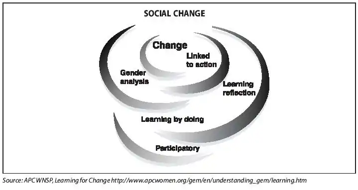 Social change as illustrated by APC WNSP below (Figure 3), includes critical reflection, implying the self and self-transformation. The element of self/self-transformation is a critical element as it relates to the personal self (as individual) and the human self (as social construct), as well as the stakeholders/audience of a particular ICT intervention. The changes that happen to the ‘self’ and how the ‘self’ affects other components are central to the gender analysis of ICT interventions. Like gender, the ‘self’ has different roles and responsibilities that can be evaluated and seen in different ways.