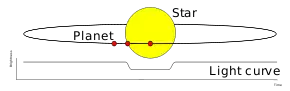 A secondary eclipse occurs when the hot Jupiter being observed passes behind its parent star, as viewed from Earth. A primary eclipse, also known as a transit, happens when the planet passes in front of the star as viewed from Earth. These eclipses are very rare because the planet, star and earth have to line up so that the planet completely eclipses.[21] Only 54 of the 333 confirmed planets are transiting planets when viewed from Earth.[22]