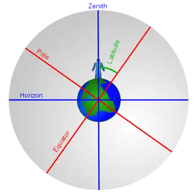 For any given latitude, one can build an appropriate celestial sphere. First, consider the sky in relation to the earth. Take the north and south poles and extend them into the sky; these become the north and south celestial poles. The Earth's equator can be projected outward to form the celestial equator. We'll get something that looks like the picture above.