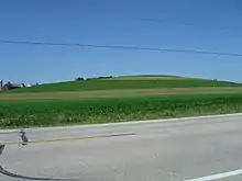Scattered throughout portions of Kettle Moraine are two different types of glacially formed hills. The type most identifiable are drumlins. These hills are smooth and elongated, composed of glacial drift. Often drumlins can be found in swarms or large groupings of multiple drumlins. From an aerial view drumlins are shaped like a tear drop with a rounded end and a tapered end, which points in the direction of glacial advance. Drumlins can only be found behind the end moraines of the glaciers that created them. The other type of hill is a kame. Kames are mounded hills of glacial drift that are formed when the drift flows into a hole in the ice. When the ice recedes the conically shaped mound is left behind.
