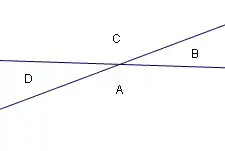In the above diagram, A and C are vertical angles, and B and D are vertical angles. Vertical angles are congruent.