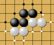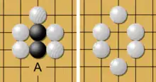 A single group of interconnected stones with one point of territory forms an eye. A group with two or more eyes cannot be captured, as at both points white could not play without the stone played having no liberties (called suicide, and is not a legal move in the Japanese rule set), and is a powerful structure within the game.