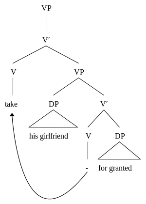 (8a) and (8b) have the same structure, but different PP complements. The word takes does not mean the same thing in both: take for granted is an idiom in (8a). Under the VP-shell hypothesis, take for granted was originally a single phrase before takes was moved to the front.