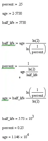 Option Explicit Dim h As Double, p As Double, n As Double, age As Double Private Sub Form_Load() h = 5730 'Where h is the Half-life of Carbon 14 p = 0.25 '(where p is the percent or portion of Carbon-14 in the archaeological sample) and defined by' 'p = 1 / (2 ^ n) 'and n is defined as the number of half lives n = log(1/p) / log(2) 'and age of the archaeological sample is defined as age = h * n Debug.Print "Half-life", "Percent", "Half-lives", "Age" Debug.Print h, p, n, age End Sub