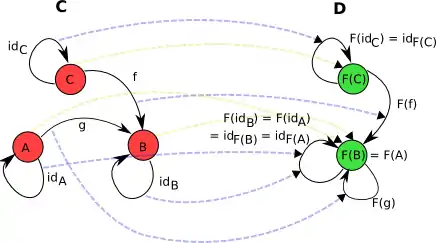Once again there are a few axioms that functors have to obey. Firstly, given an identity morphism on an object A, must be the identity morphism on , i.e.: