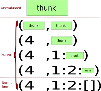 (4, [1, 2]) step by step. The first stage is completely unevaluated; all subsequent forms are in WHNF, and the last one is also in normal form.We can 'partially evaluate' (most) Haskell values. Also, there is some sense of the minimum amount of evaluation we can do. For example, if we have a pair thunk, then the minimum amount of evaluation takes us to the pair constructor with two unevaluated components: (*thunk*, *thunk*). If we have a list, the minimum amount of evaluation takes us either to a cons cell *thunk* : *thunk* or an empty list []. Note that in the empty list case, no more evaluation can be performed on the value; it is said to be in normal form. If we are at any of the intermediate steps so that we've performed at least some evaluation on a value, it is in weak head normal form (WHNF). (There is also a 'head normal form', but it's not used in Haskell.) Fully evaluating something in WHNF reduces it to something in normal form; if at some point we needed to, say, print z out to the user, we'd need to fully evaluate it, including those calls to length and reverse, to (5, "hello"), where it is in normal form. Performing any degree of evaluation on a value is sometimes called forcing that value.