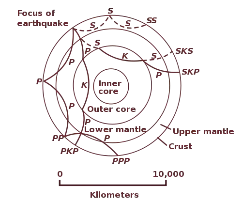 One way scientists learn about Earth's interior is by looking at seismic waves (Figure 6.1). Seismic waves travel outward in all directions from where the ground breaks at an earthquake. There are several types of seismic waves, each with different properties. Each type of wave moves at different speeds through different types of material and the waves bend when they travel from one type of material to another. Some types of waves do not travel through liquids or gases and some do. So scientists can track how seismic waves behave as they travel through Earth and can use the information to understand what makes up the planet's interior. Much more about earthquakes and seismic waves will be presented in the Earthquakes lesson.