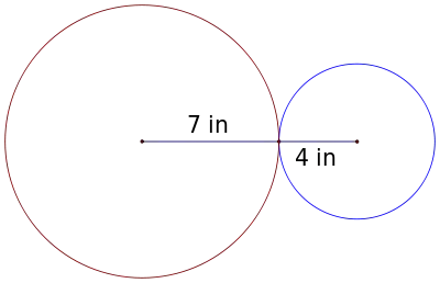 Example 3 Two connected gears are rotating. The smaller gear has a radius of 4 inches and the larger gear's radius is 7 inches. What is the angle through which the larger gear has rotated when the smaller gear has made one complete rotation? Solution: Because the blue gear performs one complete rotation, the length of the arc traveled is: