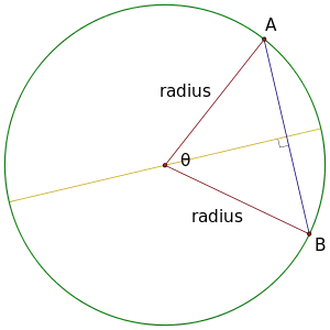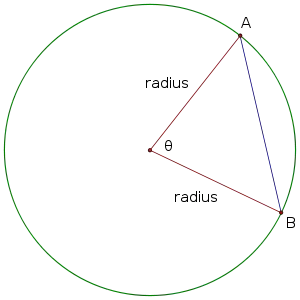 We can calculate the length of any chord if we know the angle measure and the length of the radius. Because each endpoint of the chord is on the circle, the distance from the center to A and B is the same as the radius length.