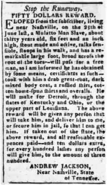 Slavery was prevalent in the Antebellum era in Tennessee, with there only being a population of 77,262 residents in the state, of which 10,613 were slaves by the year 1796. The legal status of each of these slaves were determined by the North Carolina Act of Cession which legally allowed slavery in the new statehood of Tennessee. By this time in the United States, governments had more control over slavery compared to the slave owners, which made committing any crimes against these slaves more difficult to do without consequence. This sometimes meant slaves were rewarded with “more freedom of action and movement than was allowed in the older states and regions of the lower south.” To say that these slaves and their families had it easier than others though, would be an overstatement, as the physical, mental, and emotional pain these families went through remained prevalent throughout slave history and afterwards. For young women who grew up as slaves, as explained by the Tennessee Tribute, "puberty marked the beginning of a lifetime of physical, sexual, and emotional abuse from masters and mistresses, and members of the planter family." Travelling as a slave was regulated by a system using passes which were supplied by their masters. "No slave, except a domestic servant, was supposed to leave his master's premises without a pass, explaining his cause of absence", Caleb P. Patterson noted in The Negroe in Tennessee. The rights slaves did have on these plantations included permission of one person to carry a gun for hunting during the cultivation for harvesting crops. However, if this person were caught hunting unlawfully, they were "whipped not exceeding 30 lashes." While slavery was still on the rise in the late eighteen to early nineteenth century, slaves could be purchased at about $300 each, and by the year 1832 that had risen to an average of about $800. However, in some counties including Davidson County, slaves were hired for as little as 15 dollars per year. In most circumstances, the prices of slaves would fluctuate with the rise of cotton culture as well as any changes to the country’s economic prosperity. The act of trading or selling slaves was often difficult, as it was illegal to do so between states from 1826 and 1855 and in 1823 self-hiring became illegal, which had the potential to land anyone caught doing so in trouble. It was much easier to hire slaves within Tennessee, as many slave-owners often “did not require the services of all their slaves at one time,” it was often that their neighbours would hire slaves from them for shorter periods of time. This was seen as very easy for all parties because cheap labor would be obtained by the hirer, and the owner was able to put one of his otherwise unused slaves to work for a profit.