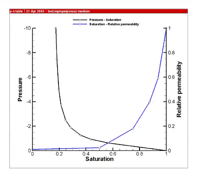This instruction generates the tables from the previously defined function parameters and writes the pressure saturation data to the file prefixo.p_s_table.material.dat and the saturation-relative permeability data to the file prefixo.s_k_table.material.dat. These files are written in Tecplot-compatible format so they can be easily plotted. The tabular values in the files can be copied into the .mprops file for use with the unsaturated table instructions described in Section 5.8.3.5.