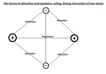 Hence, as the dot product of force an displacement increases, the potential energy decreases. And this rule explains the interactions between the atoms. For example, If two atoms come close together, three types of attractive and repulsive forces come into play. They are: