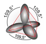 Chemist Linus Pauling first developed hybridisation theory[2] in order to explain the structure of molecules such as methane (CH4). Pauling pointed out that a carbon atom forms four bonds by using one s and three p orbitals, so that "it might be inferred" that a carbon atom would form three bonds at right angles (using p orbitals) and a fourth weaker bond using the s orbital in some arbitrary direction. In reality however, methane has four bonds of equivalent strength separated by the tetrahedral bond angle of 109.5°. Pauling explained this by supposing that in the presence of four hydrogen atoms, the s and p orbitals form four equivalent combinations or hybrid orbitals, each denoted by sp3 to indicate its composition, which are directed along the four C-H bonds.[3] Historically, this concept was developed for such simple chemical systems but the approach was later applied more widely, and today it is considered an effective heuristic for rationalizing the structures of organic compounds. It gives a simple orbital picture equivalent to Lewis structures. Hybridisation theory finds its use mainly in organic chemistry.