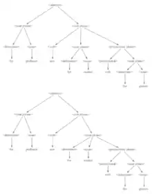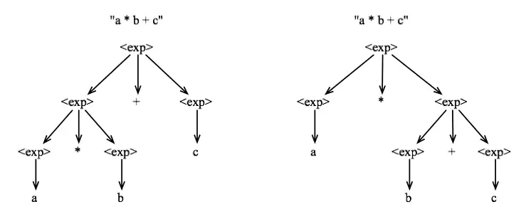 In order to see that this grammar is ambiguous we can observe that it is possible to derive two different syntax trees for the string "a * b + c". The figure below shows these two different derivation trees: