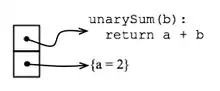 In the above example we notice that variable a is free in the body of function unarySum. This variable has been declared in the scope of the function unarySumFactory, and the fact that it can be referenced inside unarySum poses to language designers an implementation problem. Normally once a function returns its value, the space reserved for its activation record is deallocated. However, if this space is deallocated, variable a in our example would no longer have a storage location once unarySumFactory had returned a value. To circumvent this difficulty, closures are implemented as pairs (f, t), where f is a pointer to the implementation of the function, and t is a pointer to a table with all the free variables used in f associated with values.