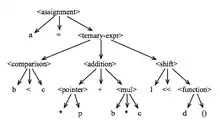 The semantics of a programming language is not defined by its syntax. There are, however, some aspects of a program's semantics that are completely determined by how the grammar of the programming language is organized. One of these aspects is the order in which operators are applied to their operands. This order is usually defined by the precedence and the associativity between the operators. Most of the algorithms that interpreters or compilers use to evaluate expressions tend to analyze first the operators that are deeper in the derivation tree of that expression. For instance, lets consider the following C snippet, taken from Modern Programming Languages: a = b < c ? * p + b * c : 1 << d (). The side figure shows the derivation tree of this assignment.