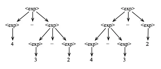 By adding the mulexp node into our grammar, we have given division higher precedence over subtraction. However, we might still have problems to evaluate parsing trees unambiguously. These problems are related to the associativity of the operators. As an example, the expression 4 - 3 - 2 can be interpreted in two different ways. We might consider 4 - 3 - 2 = (4 - 3) - 2 = -1, or we might consider 4 - 3 - 2 = 4 - (3 - 2) = 3. The two possible derivation trees that we can build for this expression are shown below: