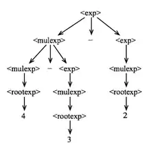 <exp> ::= <exp> - <mulexp> | <mulexp> <mulexp> ::= <mulexp> / <rootexp> | <rootexp> <rootexp> ::= ( <exp> ) | <number>