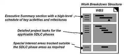 The upper section of the Work Breakdown Structure (WBS) should identify the major phases and milestones of the project in a summary fashion. In addition, the upper section should provide an overview of the full scope and timeline of the project and will be part of the initial project description effort leading to project approval. The middle section of the WBS is based on the seven Systems Development Life Cycle (SDLC) phases as a guide for WBS task development. The WBS elements should consist of milestones and “tasks” as opposed to “activities” and have a definitive period (usually two weeks or more). Each task must have a measurable output (e.x. document, decision, or analysis). A WBS task may rely on one or more activities (e.g. software engineering, systems engineering) and may require close coordination with other tasks, either internal or external to the project. Any part of the project needing support from contractors should have a Statement of work (SOW) written to include the appropriate tasks from the SDLC phases. The development of a SOW does not occur during a specific phase of SDLC but is developed to include the work from the SDLC process that may be conducted by external resources such as contractors and struct.[8]