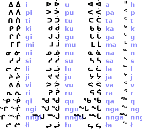 The syllabary used to write Inuktitut (Titirausiq Nutaaq). The extra characters with the dots represent long vowels; in the Latin transcription, the vowel would be doubled.