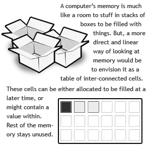 Variables and all the information they store are kept in the computer's memory for access. Think of a computer's memory as a table of data — where each cell corresponds to a variable.