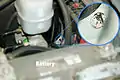 Once you have the kick panel removed, grab the edge of the carpet and pull toward the brake pedal. This will allow you to see the sound insulation on the inside of the firewall. You can see where this insulation fits around the main wiring harness (Fig 2). Take note of the bolt coming thru the small plastic fitting. This bolt will help you locate the firewall plug later.