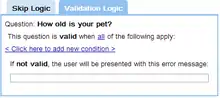 On the previous page we discussed how we could direct a users responses by defining a certain question type. For example, we can limit the responses to numbers by choosing the question type decimal or even to only whole numbers by using the question type integer. However, sometime is is necessary to limit the range of possible responses even further, for example, to only positive numbers, for this we use validation logic.