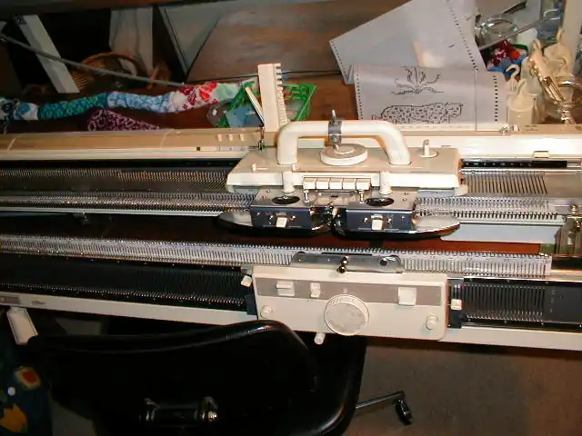 A knitting machine is a long apparatus furnished with a row of hooked needles, or rather, casting-on needles. Usually there are 200 needles. They sit in a base which is called the needle bed. A part of the needle (the butt) protrudes through the needle bed and it is this which makes contact with the knitting carriage. The carriage, which is pushed across the stitches, has on its underside several 'cams' which govern the movement each needle will make as the carriage is moved across the bed. Every needle has a latch which may be tilted back and forth, whereby it opens and closes the access to the hook of the needle. The stitches sit in the hooks, and when you drive the carriage across the needles, they first are pushed up into the upper position, whereby the stitches push back the latches. Next, the yarn feeder lays new thread into the hooks. After that, the needles are pushed down again, whereby the old stitches push the latches forward, shutting off the needle hooks and sliding out over the needles. At this moment, the new stitches have been formed. In the oldest machines, these cams were quite simple, and therefore the machines could do little but knit forwards and backwards. Newer machines have various buttons that you can move or push in order to change the needle routes. This allows for textured and multi-coloured patterning. For instance the needles may be pushed completely forward, whereby they slip into a trail where they are not included in the knitting - unless you move another button, which again includes them. On older machines, you have to include them manually.