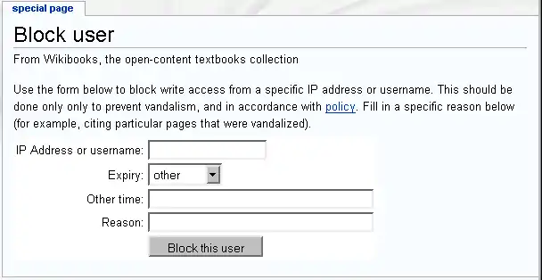 It is also possible to block IP addresses from being able to edit text. This does not stop a registered user on that IP address from being able to log in, but only stops anonymous users from using the edit functions. If there is a problem where a registered user is unable to access the Wiki due to an anonymous IP block, then the user must unblock that IP and reblock with anonymous users only checked.