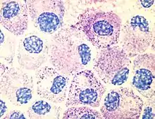 The thumbnail on the right shows the typical features of a cell as seen under with a light microscope using a standard stain. The chief features are a cell membrane, a granular cytoplasm, and a nucleus with in most cases a darker staining nucleous.