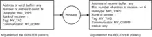 The computation part is now replaced by two calls to MPI_SEND and MPI_RECV. The arguments of the MPI_SEND function are the address of the first element to send, the number of elements to send, their type (the more common MPI types are MPI_INT, MPI_CHAR, MPI_FLOAT, MPI_DOUBLE, ...), the rank of the receiver, the tag of the message, and the communicator. In the simplest usage, the communicator would be MPI_COMM_WORLD, which includes all the processes sharing in the execution of the program. The arguments of the MPI_RECV function are the address of the receive buffer, the maximum number of elements to receive, their type, the rank of the sender, the tag of the message, communicator, and the status. For a common message, the type, the tag and the communicator must be the same (see figure below).